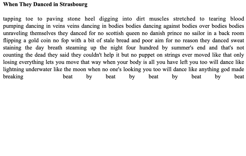 pumping dancing in veins veins dancing in bodies bodies dancing against bodies over bodies bodies